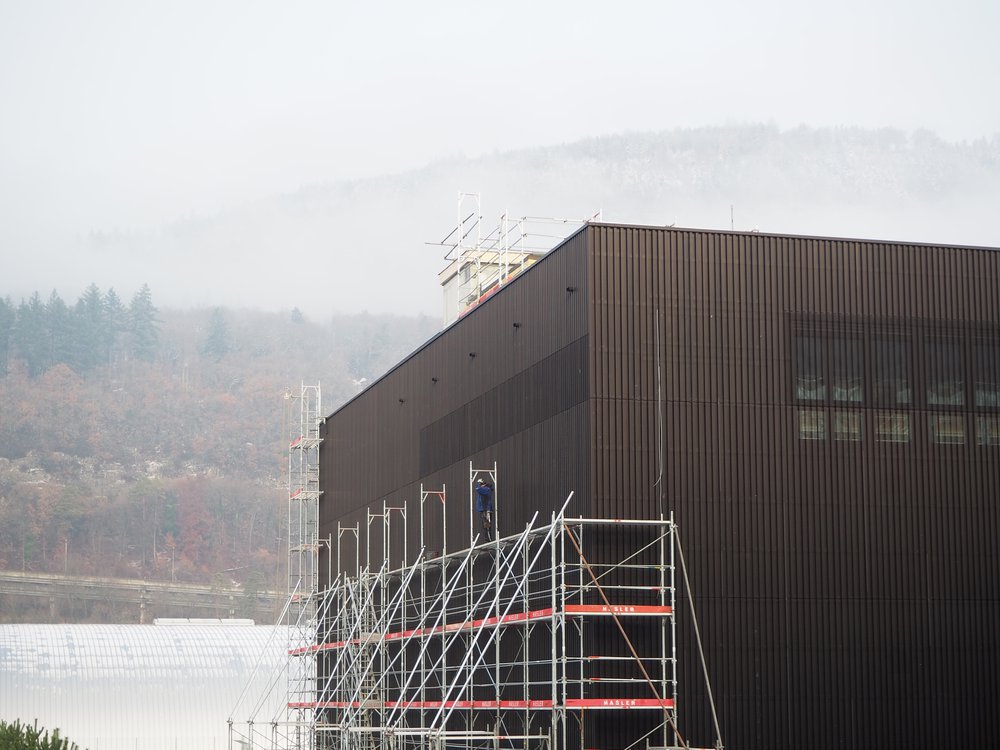 Die Dreifachsporthalle in Wettingen wächst von Tag zu Tag. Im spektakulären Video sieht man, wie die ersten der 33m langen Dachträger versetzt werden.
