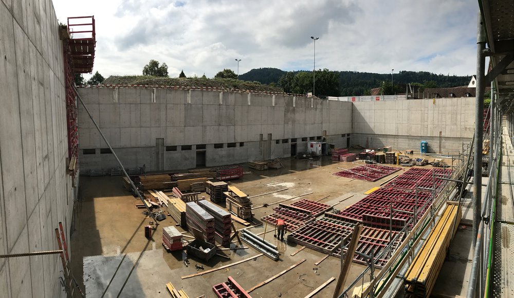 Der Hallenraum der Dreifachsporthalle zeichnet sich derzeit als grosses Loch ab, hier der Blick von der zukünftigen Zuschauergalerie. Ab Mitte September werden die Dachträger der komplett versenkten Halle eingebaut. Die Eröffnung ist für Sommer 2018 terminiert.