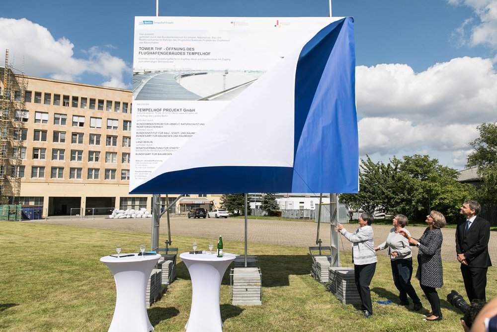 Die Enthüllung der Bautafel durch Bundesbauministerin Dr. Barbara Hendricks am 23.08.2017 steht für den Arbeitsbeginn am grössten Baudenkmal Europas. Mit der schrittweisen Öffnung und Nachnutzung der "Mutter aller Flughäfen“ (Sir Norman Foster) beginnt ein neues Kapitel für den Flughafen Tempelhof. Die Bauarbeiten an dem von :mlzd geplanten Besucherzentrum im ehemaligen Towergebäude beginnen sobald die Schadstoffsanierung abgeschlossen und die Baubewilligung erteilt ist.