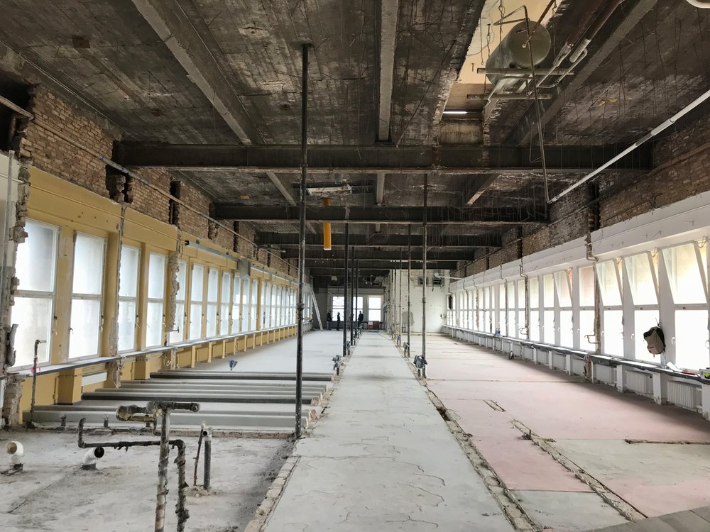 Am zukünftigen Besucherzentrum des Flughafen Tempelhof haben die Rückbaumassnahmen samt Schadstoffsanierung begonnen. Das zukünftige Ausstellungsgeschoss im 6.OG zeigt bereits seine grosszügigen Abmessungen.