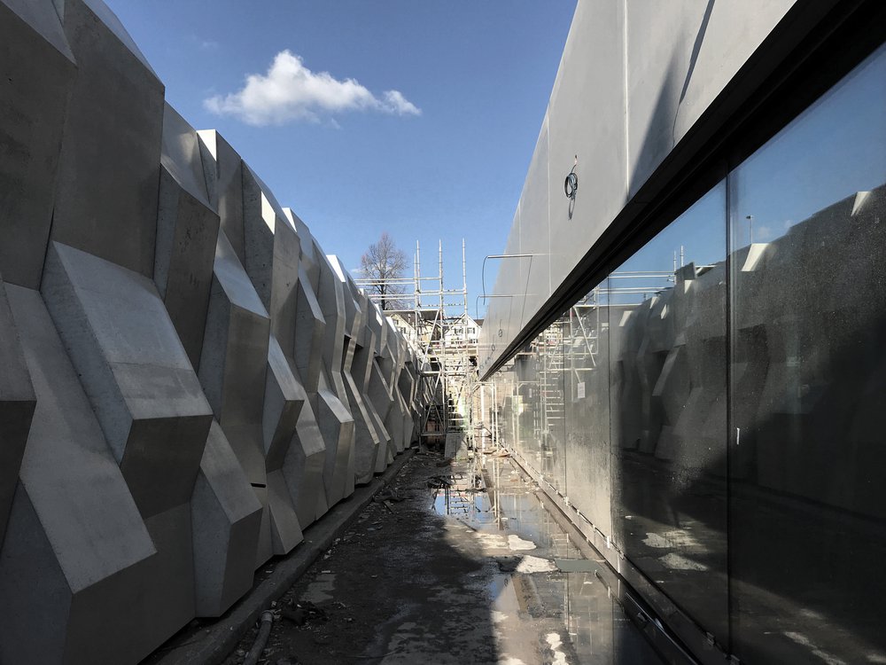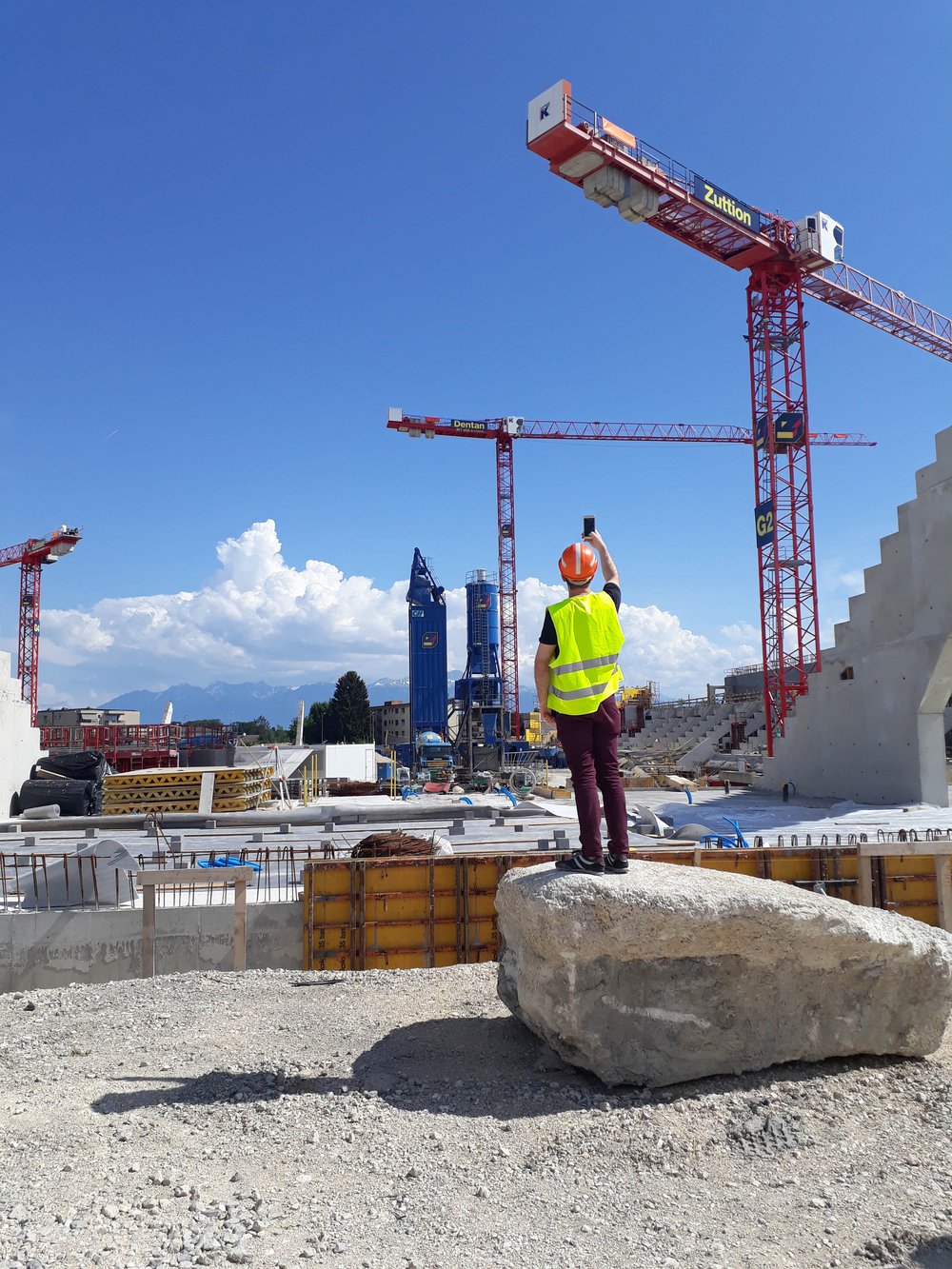 Auf unserem Büroausflug, zusammen mit Sollberger Bögli Architekten, konnten wir den Fortschritt der Bauarbeiten des Fussballstadions begutachten. Die Form des "Kessels" wird dank den kolossalen Sägezahnträgern allmählich erkennbar. Zu dem Eindruck trägt auch die Haupttribüne bei, von welcher die Rohbauarbeiten bis auf die Höhe des ersten Obergeschosses fertiggestellt sind. Auch die Mauerwerkarbeiten des Umlaufes sind weit fortgeschritten, so dass man einen ersten räumlichen Eindruck von der späteren Zuschauerverteilebene erhält. Die Ecken des Stadions nehmen schrittweise ihre identitätsstiftende Form an und lassen die schiere grösse der zukünftigen Eingänge erahnen.