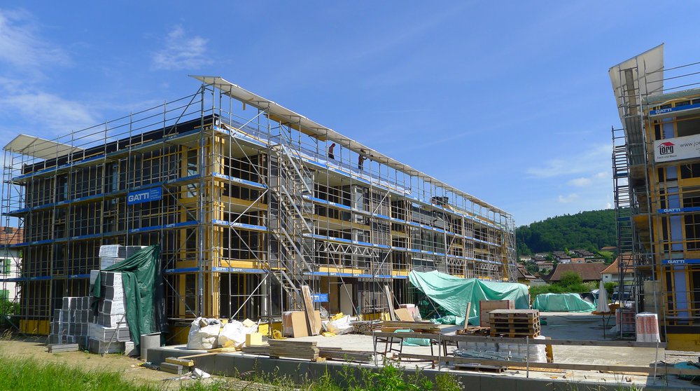 Die Bauarbeiten auf der Kochermatte in Aegerten sind in vollem Gange. Die Arbeiten mit dem Kran sind abgeschlossen, nun liegt der Fokus auf den Fassadenarbeiten.