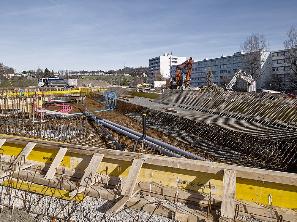 Die Rohbauwände des Untergeschosses stehen und die Arbeiten für die umlaufenden Tribünen sind am laufen. Auf dem Bild zu sehen die schlaffe Armierung von einer der Ecken.