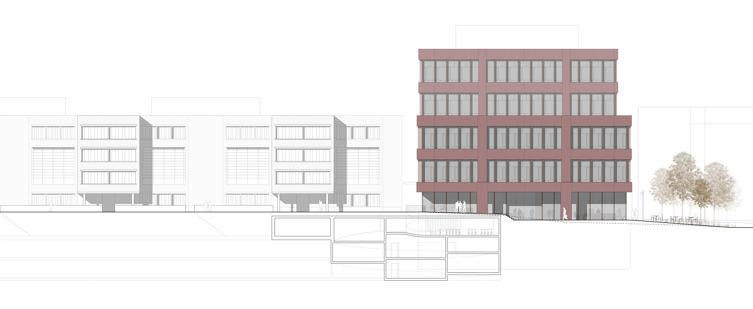 Der Neubau des Laborgebäudes soll mit den Bestandsgebäuden als städtebauliche Einheit funktionieren. Der Entwurf sieht dazu einen kompakten Baukörper vor, welcher sich in die Reihe des Buchenhof-Bestandsgebäudes stellt. Alle Gebäude werden darüber hinaus über ein ordnendes, linerares Erschliessungsband zusammengeschlossen, wobei der Neubau mit der ‚Villa’ den Eingang und Auftritt des Campus formuliert. Eine städtebauliche Vermittlung zwischen dem neuen Laborgebäude und dem ‚Atrium’-Gebäude findet im dreieckigen, als Aufenthaltsbereich gestalteten Aussenraum statt. Eine weitere Kontextualisierung erfährt das Neubauvolumen durch die volumetrische Verjüngung der Obergeschosse, welche in Form eines allseitigen Rücksprungs auf Höhe der nördlich und südlichen Bestandsbauten erfolgt. Die dadurch in ihrer Strenge aufgebrochene Silhouette, sowie die von den Strassen stark eingerückte Positionierung machen das Laborgebäude zu einem städtebaulich markanten aber vornehm zurückhaltenden Protagonisten.