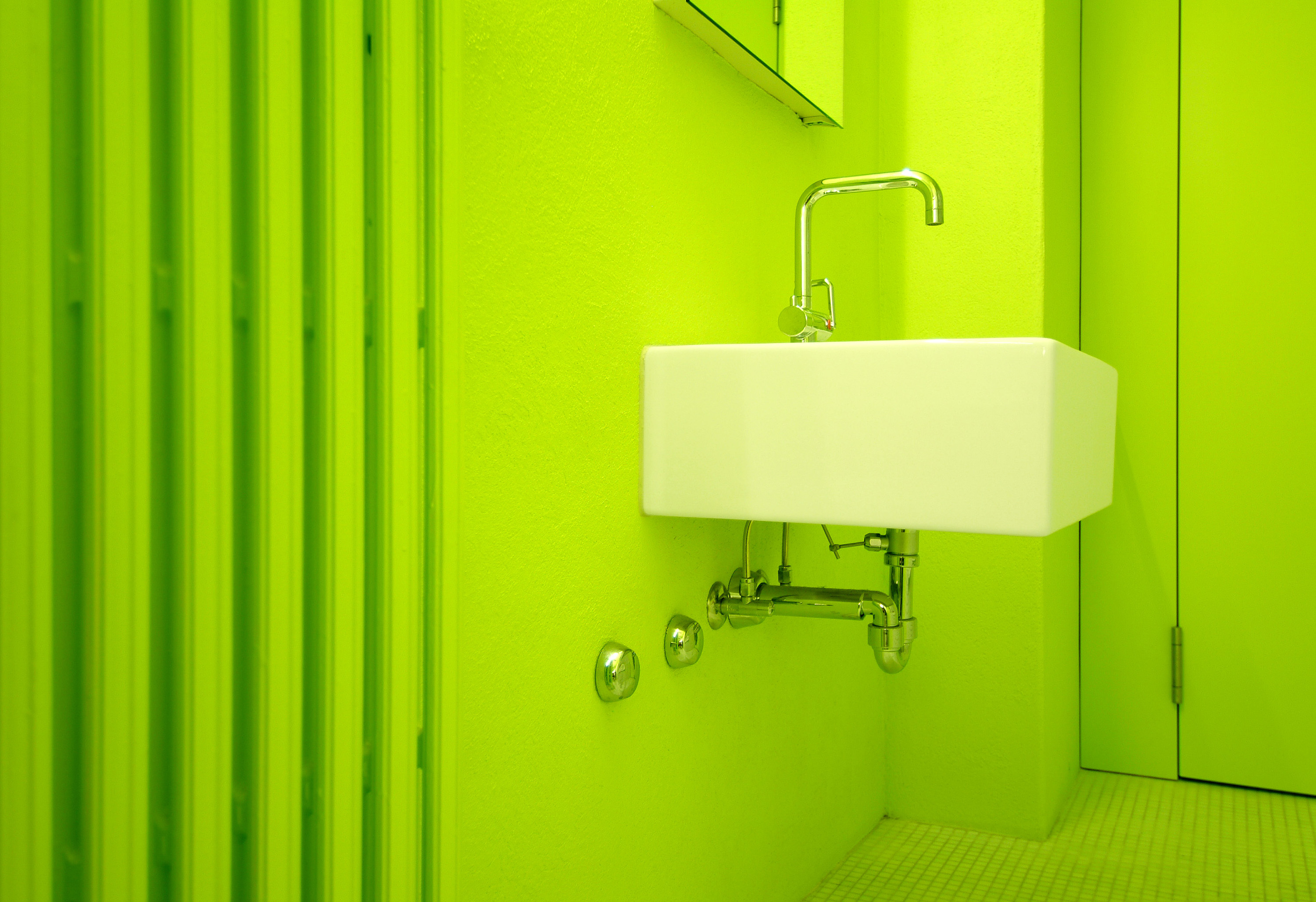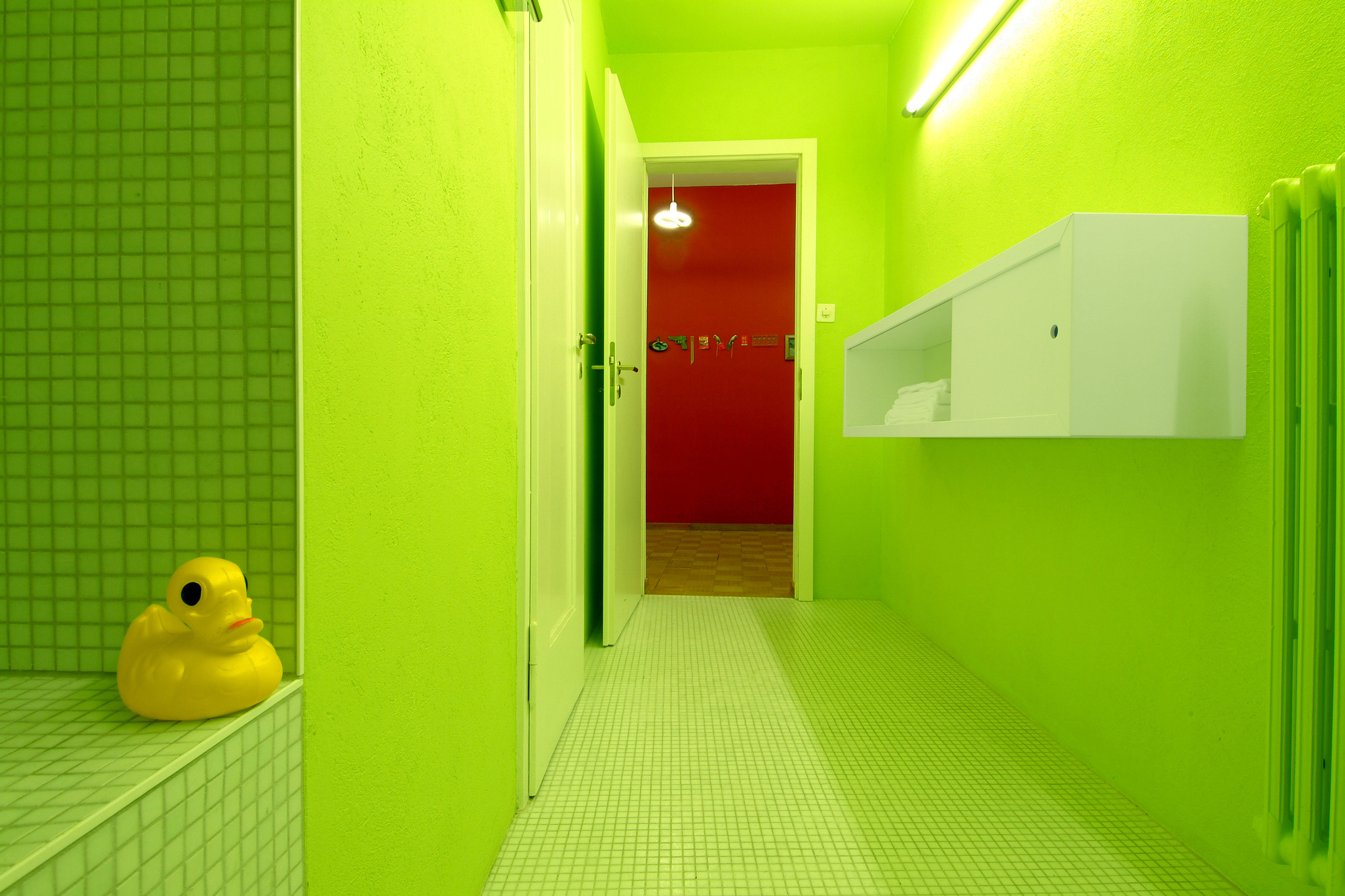 Parkettböden werden abgeschliffen, die Wände gestrichen und die sanitären Installationen vollständig erneuert. Das Bad wird mit weissen Mosaikplatten gefliest; die Wände erhalten ein grelles Granny-Smith-Grün. Die Künstlichkeit dieser Farbe wird durch ein Lichtband noch verstärkt. Der Raum kontrastiert mit den restlichen, eher warmen Farbtönen in der Wohnung. Die Küche ist als Schrankwand ausgebildet und fügt sich passgenau in die bestehende Wandlücke ein. Die Oberfläche besteht aus dunkelbraunen phenolharzbefilmten Sperrholzplatten, die mit dem warmen Orangeton der Wand und dem hellbraunen Eichenparkett-Boden perfekt harmoniert. Die Küche ist so nicht nur Ort der Produktion, sondern wird zu einem Ess- und Wohnraum mit hoher Aufenthaltsqualität.
